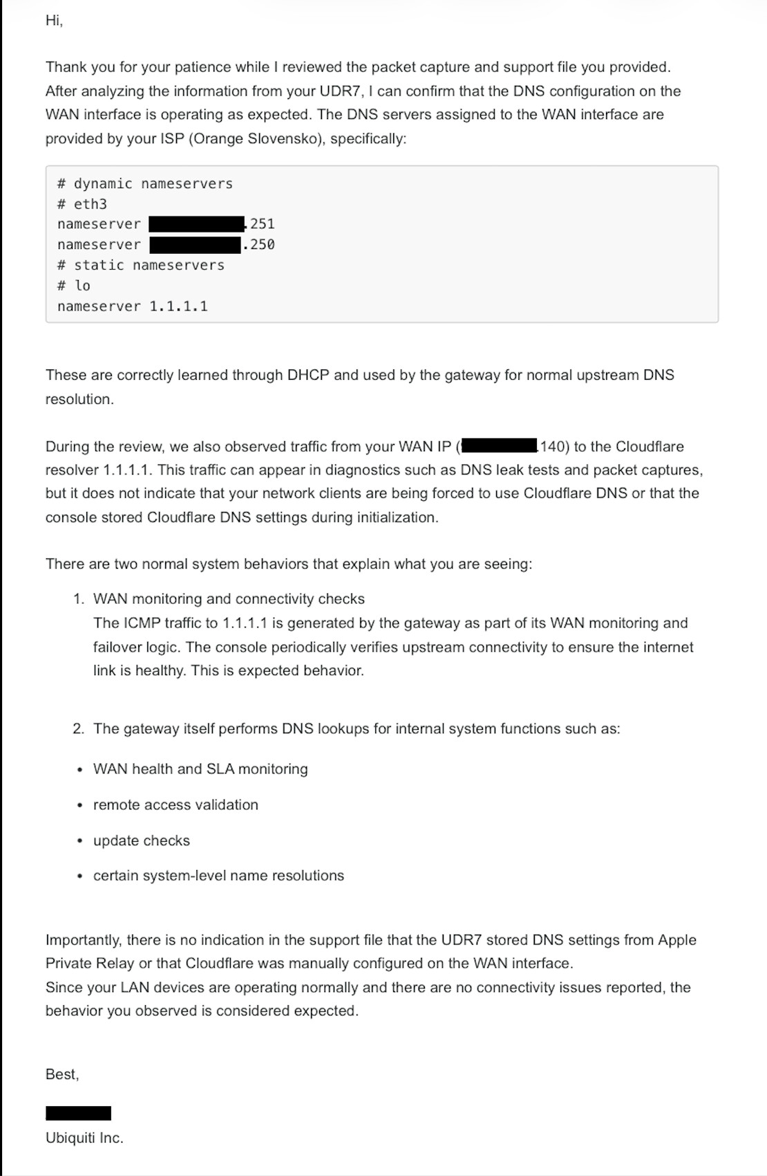 Here’s Ubiquiti’s response regarding the unexpected Cloudflare DNS servers: