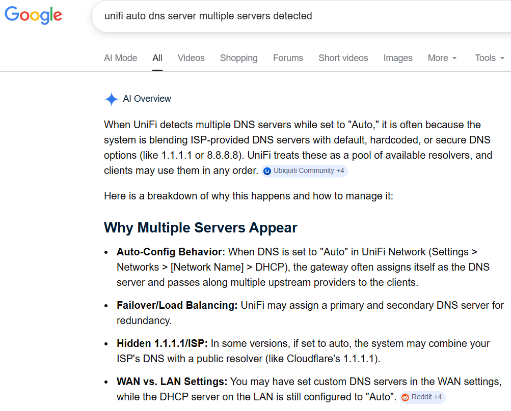 What I have since found is Unifi do the following: “When UniFi detects multiple DNS servers while set to “Auto,” it is often because the system is blending ISP-provided DNS servers with default, hardcoded, or secure DNS options (like 1.1.1.1 or 8.8.8.8). UniFi treats these as a pool of available resolvers, and clients may use them in any order.” . If you Google “unifi auto dns server multiple servers detected” you will find this information. No other router/gateway seems to employ the method Unifi has in place for DNS servers.