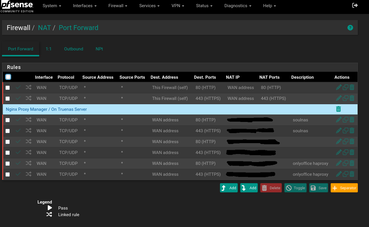 If you’re binding HAProxy to all interfaces on pfSense (which is the default), I don’t think you need a NAT rule. Let’s say you have a service, nc.example.com. Clients query DNS and get back your IP and HAProxy deals with the traffic. There’s no separate network address to translate the traffic to (which is what NAT does). Instead, a simple rule on the needed interfaces would do the trick. What I’ll usually do in this instance is use a floating rule with the “quick” setting checked and choose all the interfaces I’m after with a destination of “This Firewall.”