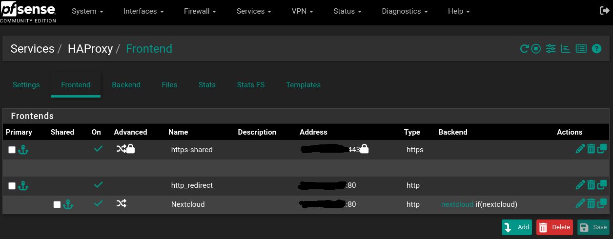 What are the IP addresses of the nodes involves? Even redacted versions would help see the relationships (i.e. pfsense is at x.x.0.1, haproxy is at x.x.0.3, nextcloud is at x.x.2.33, etc.)