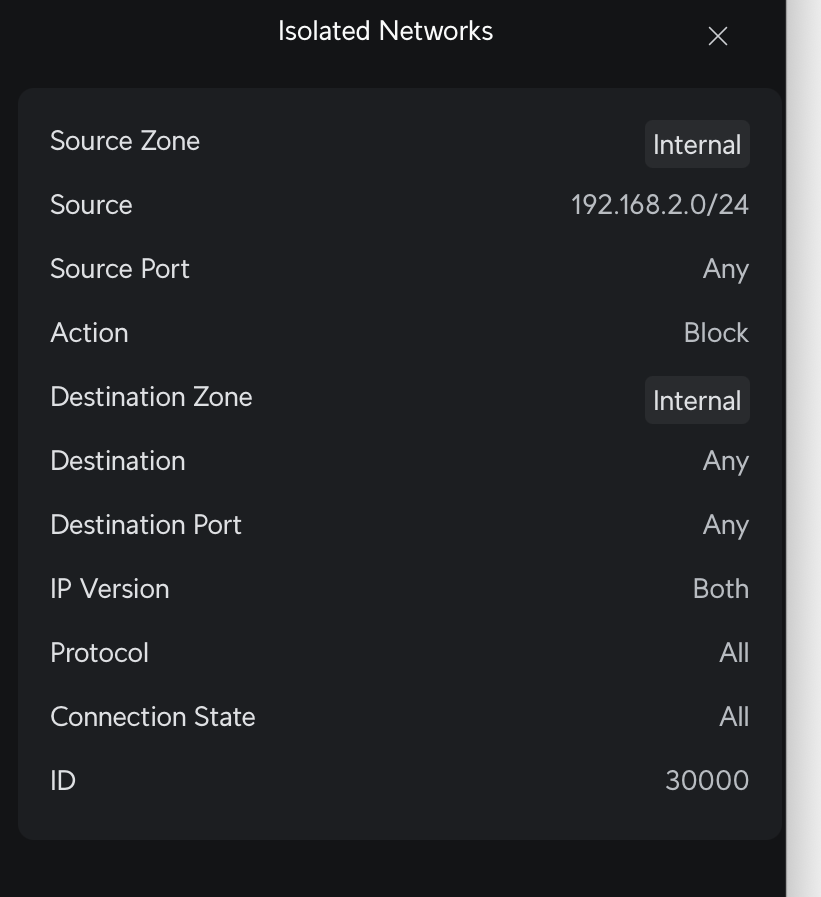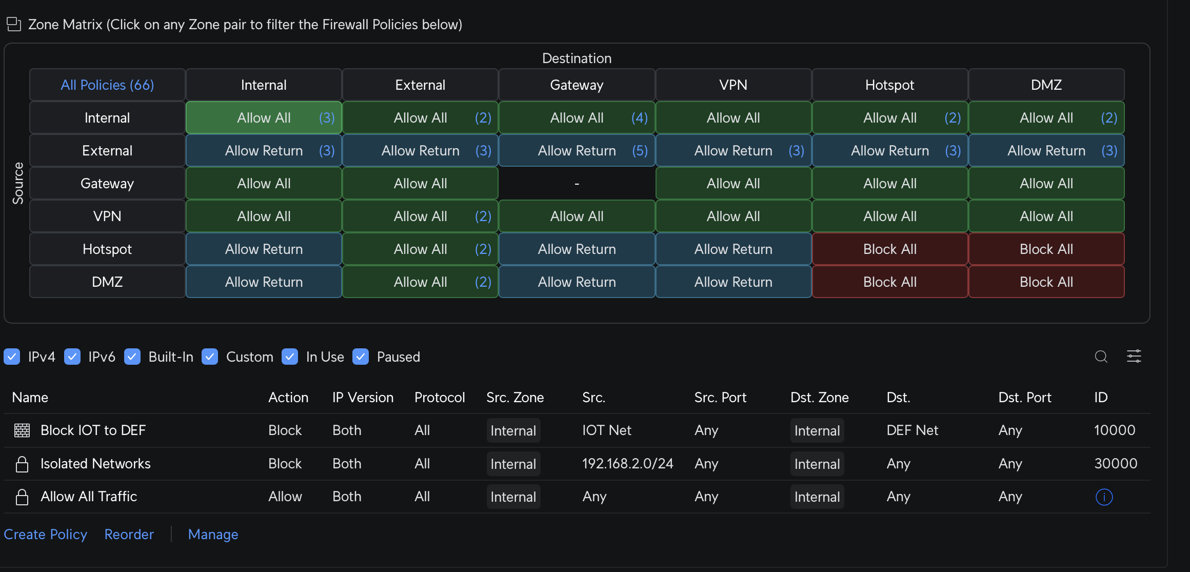 In zone firewall II created an Internal to Internal rule - Block IOT to DEF with Return Traffic allowed.