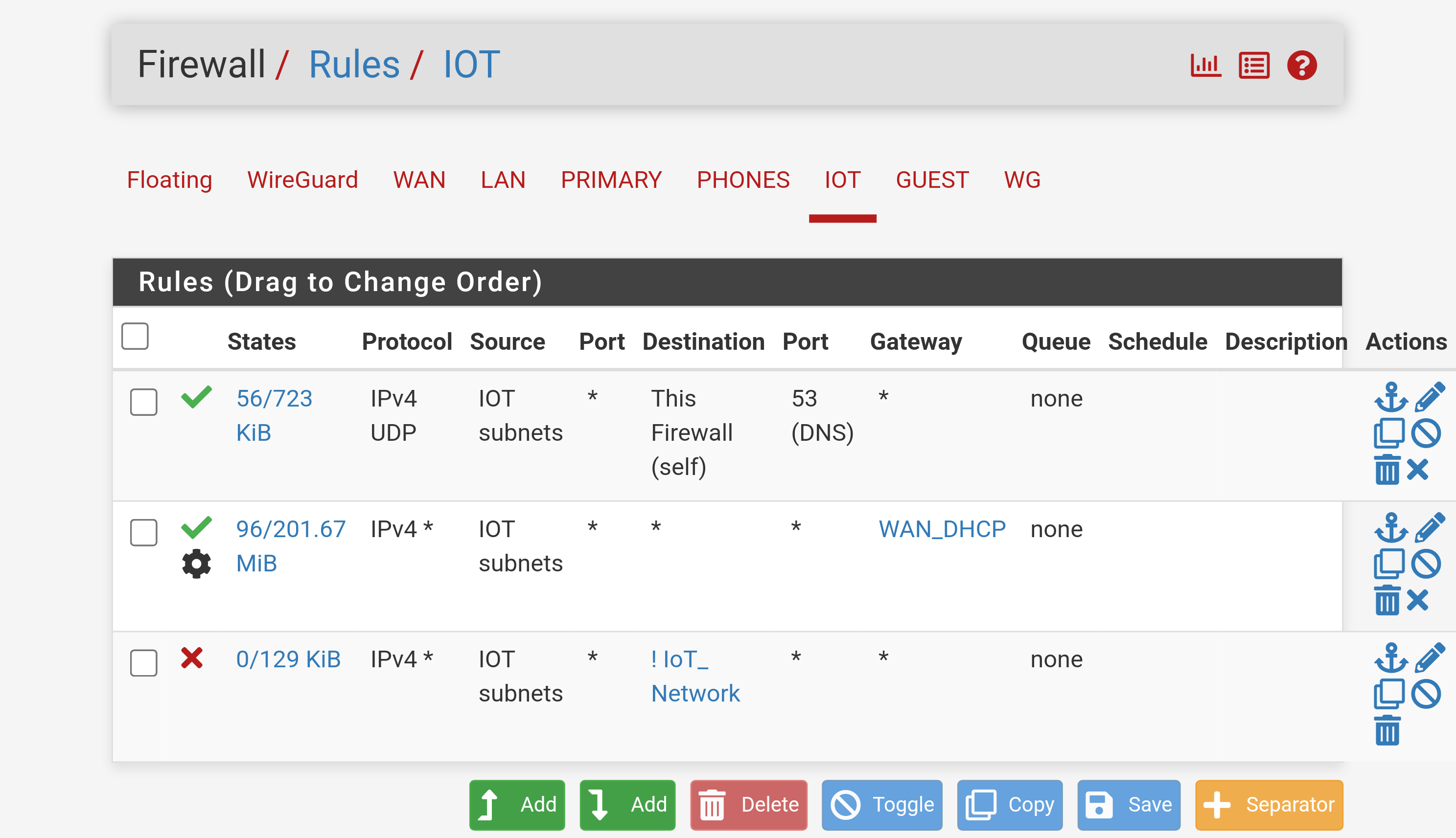 Regarding the gateway - it’s very weird that gateway monitoring is happy but a ‘ping’ from the router to the internet fails. Under ‘Status->Gateways’, check the Gateway address and the monitor address. Are they the same? Try pinging that address from the laptop (both when it’s on the ‘LAN’ network and the ‘IOT’ network).