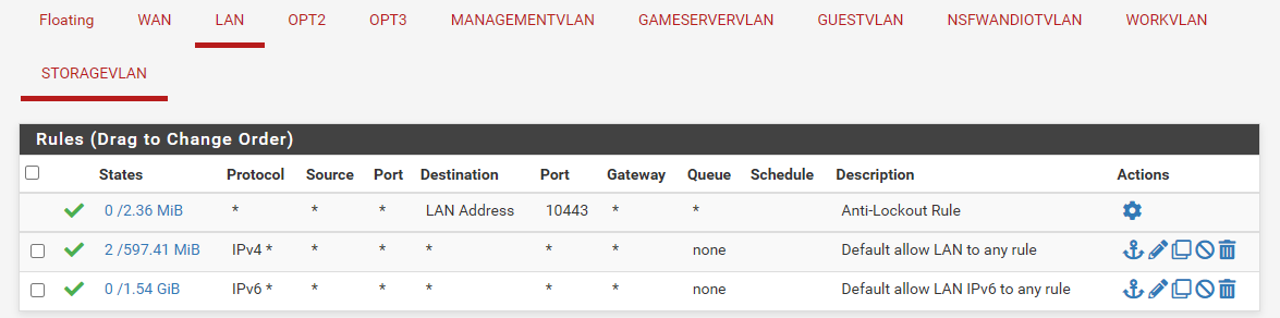 I’m running a pFSense firewall. I have multiple VLANS setup. For some reason some things are communicating fine across the vlans and other things are not. For example my desktop is on the default lan which is 192.168.44. My desktop can see some things on my management vlan which is vlan 45 192.168.45. For example my desktop can see my IPMI interface for my pfsense box, file server and xcpng server. It can also see the management interfaces for Unifi, XOA. However it can not see the management interface for Truenas or some vm’s that I have on my management vlan unless it’s on the same vlan. For vlan rules all I have setup currently is allow all. I looked at my firewall logs and I am not finding anything being block for my desktop to vlans or for that matter anything going to my truenas management port. I’m stumped any thoughts?