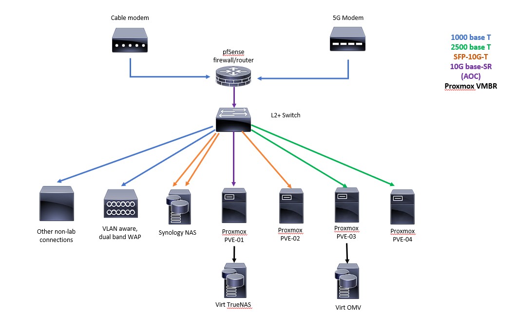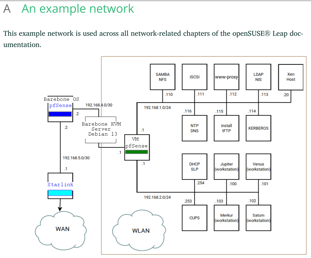 My Barebone pfSense OS handles all VLAN’s, Rules etc., I do all my testing and stuff on the Debian Lab which also has a VM pfSense isolated network resembling the diagram as well, before implementing it on the isolated pfSense Network (which I call stage II Production QOS), and from their to the Barebone Debian 13 Production Sever not shown on the diagram.