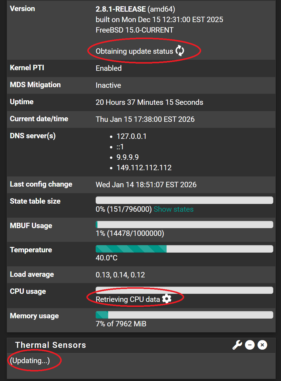 Under the System Information widget, both the Version : Obtaining update status and CPU usage : Retrieving CPU data just sit there and spin never actually updating with any information. I’m also no longer getting any information under the “Thermal Sensors” widget like i used to.