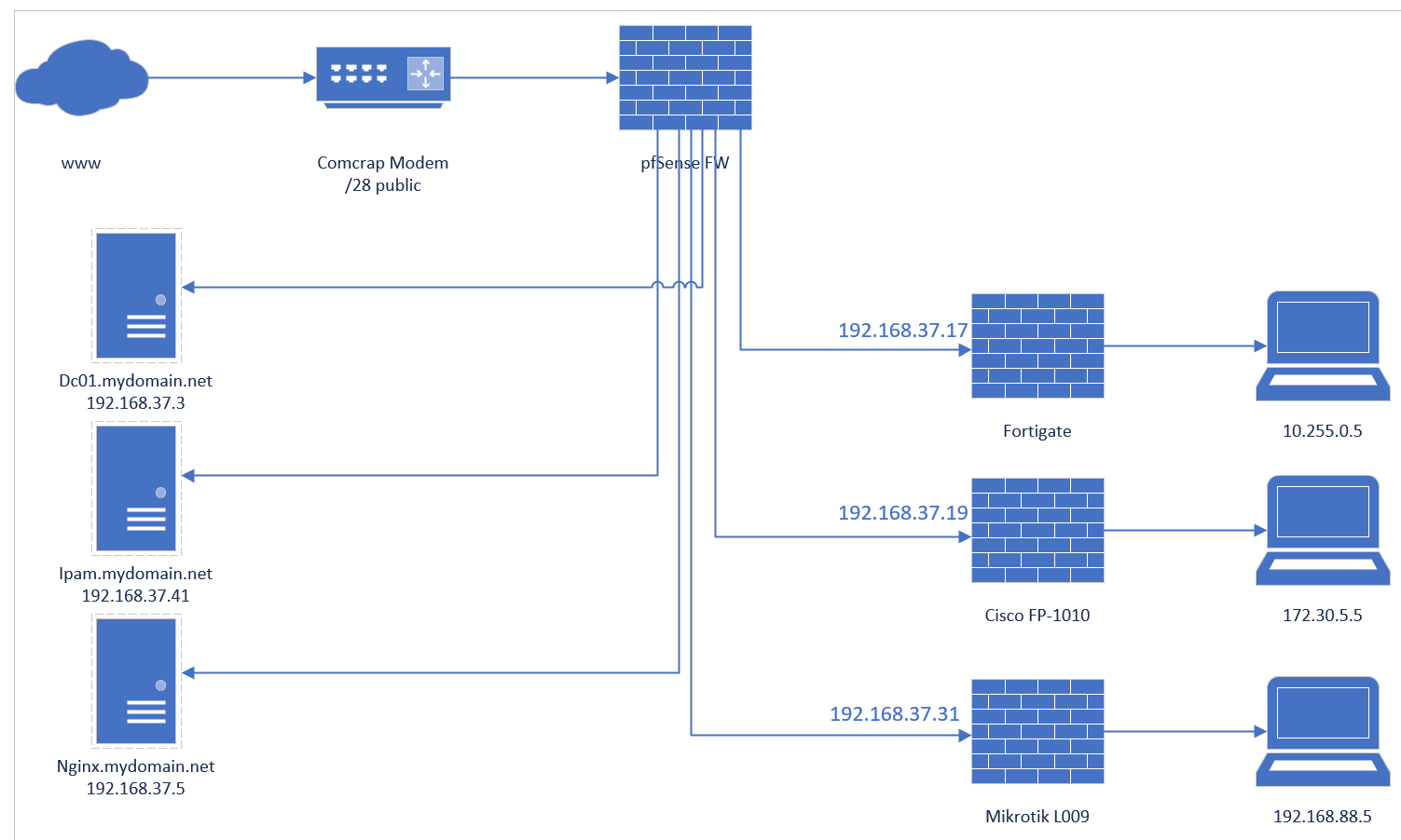 The image I provided is crude and missing a bunch from my home lab. All devices that share a 192.168.37.x are on vlan 37. I have routes and access rules in the pfs box pointing to each of the other FWs. The laptops on each of their respective networks can ping all the servers. They each can only access the fqdn of the servers if ping fqdn first. If I dont the webgui times out unreachable, then I ping from cli and within a second or two it the page comes up.