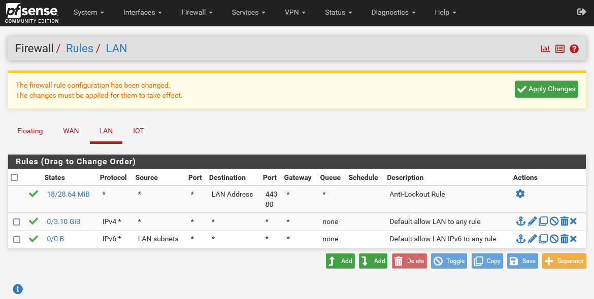 And, yes, I know the rule restricting the IoT side must be in the LAN interface. I just can’t find in the existing rules anything that should block access to the IoT.