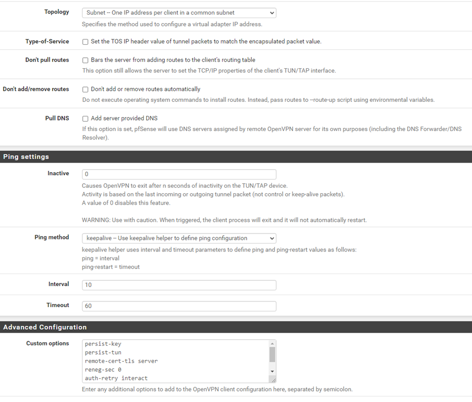 I have screenshoot my VPN client settings, and paste it here so that if you wish you can go through it, I have gone through it 3 times and I can’t find any issues.