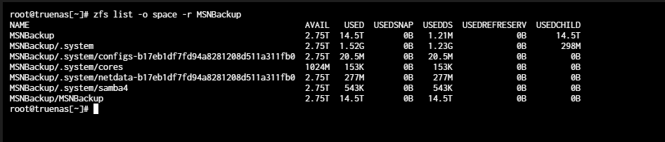 Here is an issue i have 17.21TB space and It is saying I am at 84% of used space, and there is no way. There is no snap shots either. how do I reclam 14.46TB of space. Also there is no hiddin snap shots either. I have done quite a bit of research but i cannot find what i am looking for to free up the space. The most I am using is about 2.09 as that is my backup from a file share. I am not seeing what is eating up the space. I am not using any apps or jails. running this command for the space for the pool is this see pic below.