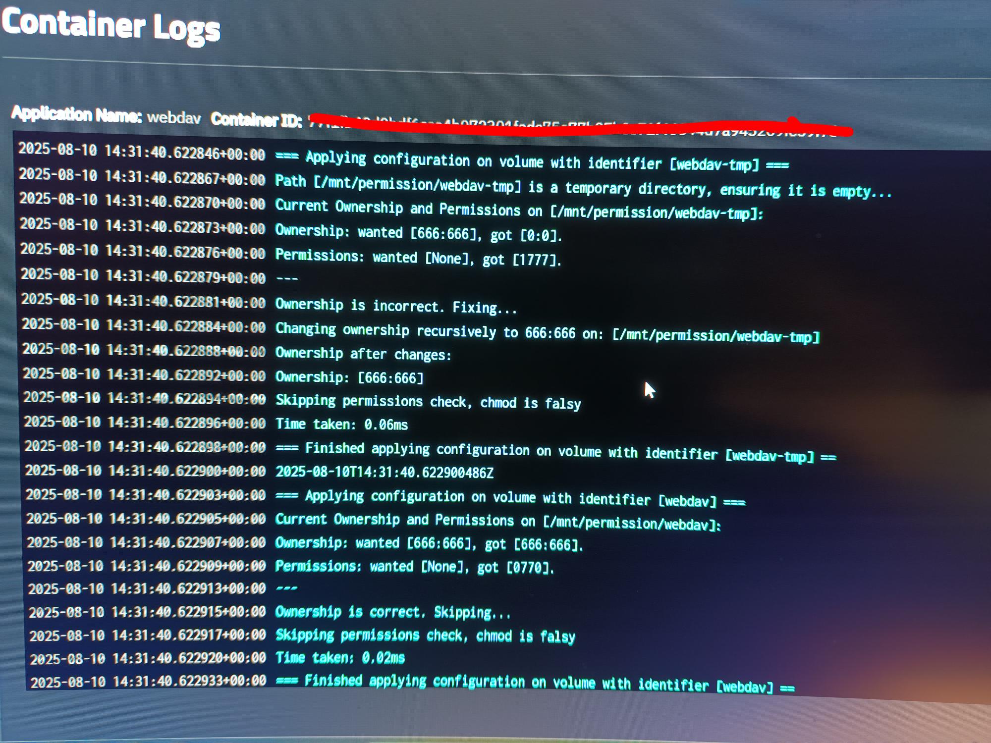2025-08-15 12:22:24.648584+00:00Changing ownership recursively to 568:568 on: [/mnt/permission/webdav-tmp]