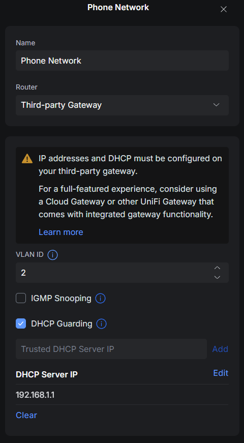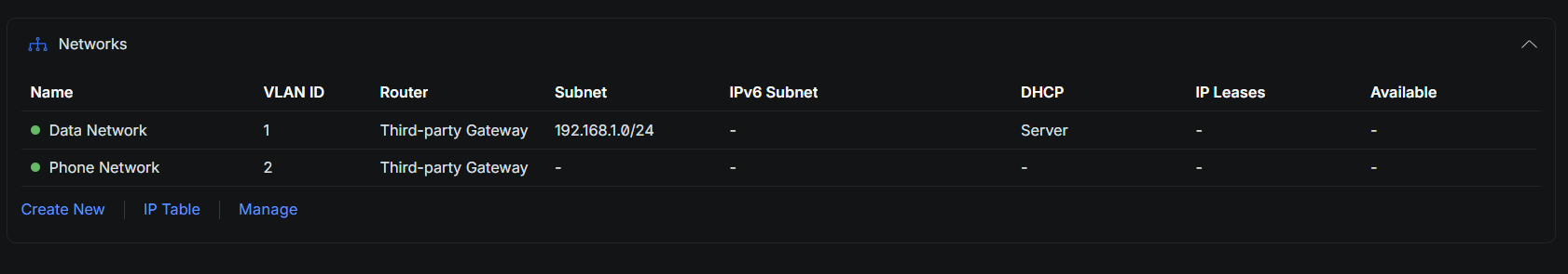 I am setting up a network that has a firewall upstream that provides IP addresses for client machines. I also have a separate dedicated phone network router that provides IP addresses to phones only (connected to the internet, but only provides VoIP, no other traffic). I have created two networks in my unifi controller, Data (Default) and Phones. Both of these DHCP servers currently are connected to the same switch (USW-Pro-Max-48-PoE) using port 2 for the Phone Network and port 47 for the Data Network. I set all the ports on the switch to the Data network, except for those ports which have phones connected and they are set to the Phone network.
