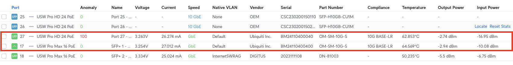 The problem is as already stated the link between basement and floor 2. Both SFP+ are Ubiquiti SFP+, namely those 10G Bidirectional Single-Mode Optical Module, Part-no: UACC-OM-SM-10G-S-2: