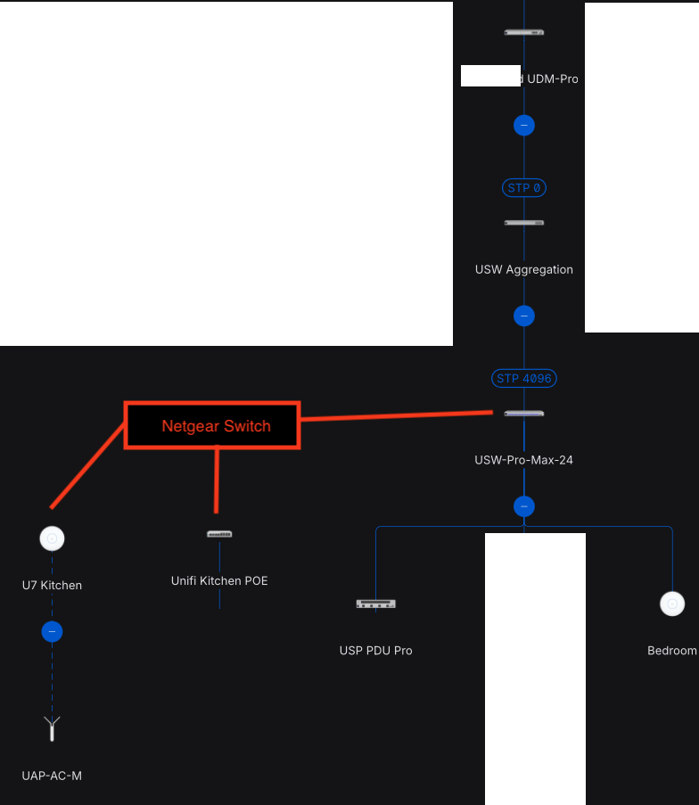 UDM Pro is connected to an Aggregation switch (STP0) which has a Pro Max Switch (STP4096) and a Netgear switch (STP4096) attached. There is one more Unifi switch connected to to the Netgear switch with an STP of 8195. I specify the STP, as this is the last thing I remember playing with before I noticed problems. But I don’t see any STP blocking issues, and the settings seem valid based on Unifi’s documentation.
